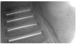 一次风机为双吸离芯式通风机,有两个吸入口,在两个吸入口处布置两套导叶,通过调整导叶的开度起到调整风机的风压及风量,每套导叶由16个叶片组成,16根长轴及短轴组成,外部由圆形导轨将16根长轴连在一起。原来长、短轴材质为普通碳钢,容易生锈卡涩,长、短轴外径图6安装后一次风机导轨与轴孔配合太小,容易卡涩。外部圆形导轨太薄容易变形,导致叶片开关卡涩。